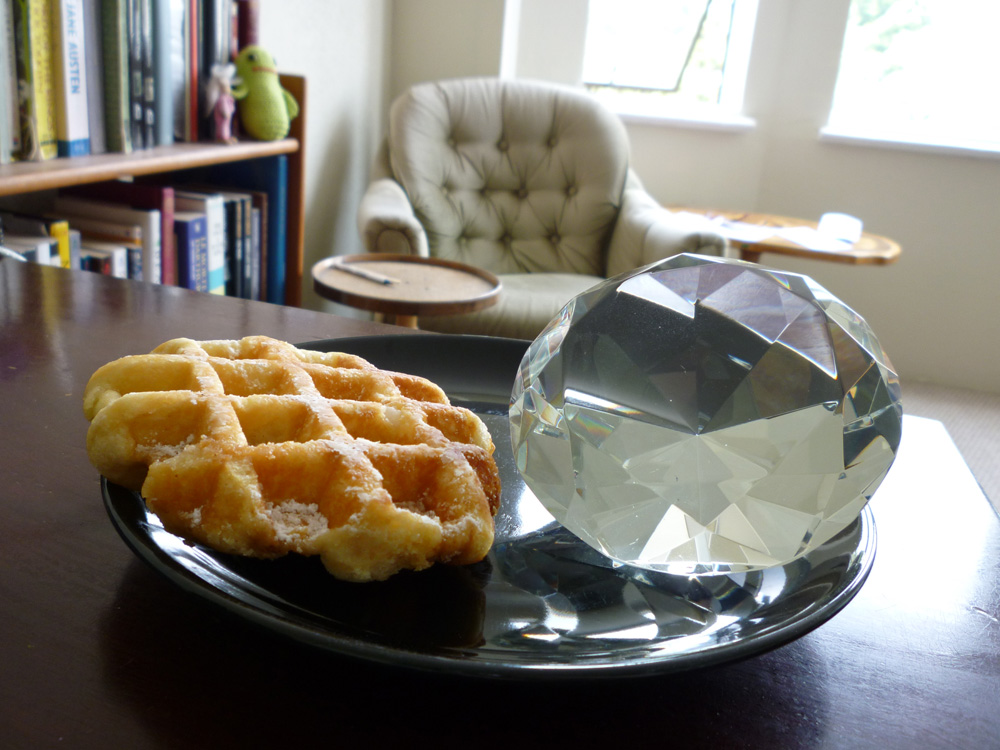 They had these giant glass shinies at the dollar store. I needed one for my hoard. The waffle was damn tasty, too. It had little bits of crystalized sugar in it, so they paired oddly well.