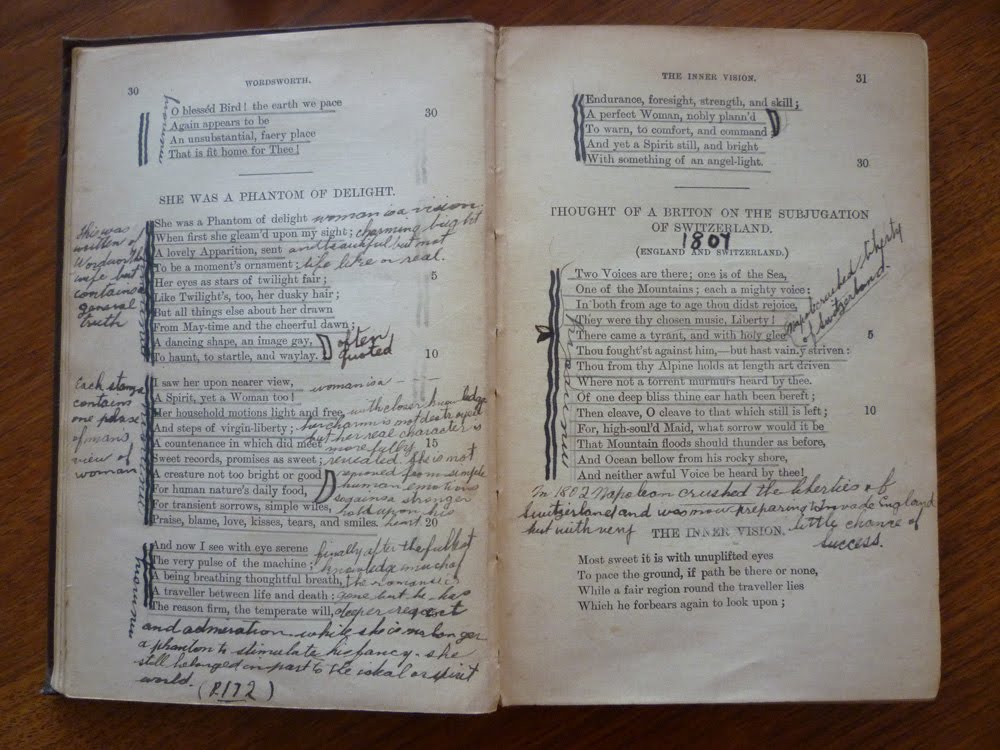 The best part about the cabin is sifting through all the old stuff. Like this mouldering cloth-bound poetry book, with my grandfather’s professorial notes.