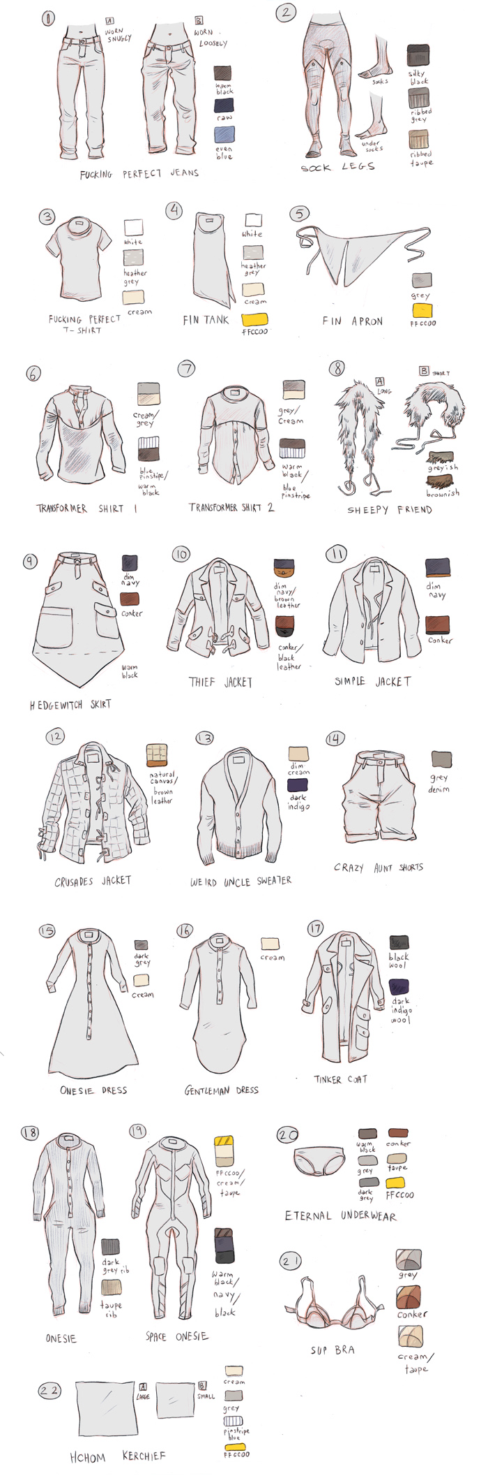 The pockety jacket, coat and skirt would be like the thesis of the collection. A shiny in every pocket! Sometimes a stone, sometimes a feather, sometimes a little ball of waxed string, sometimes a glossy chestnut. Hell, seeing as these don’t exist and never will, I can be as generous as I want. So let’s say that each piece just comes with a hidden treasure, hoard-ready.
