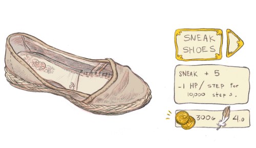 So these shoes are like a training-wheels version of lady shoes. I don’t have much of a shoe fixation, not even secretly beneath my seventeen impenetrable anti-girl firewalls. I reserve that sort of fervor for jackets. But I liked these, because I thought they looked sneaky. Which is another protective mechanism of mine, by the way. If I see something feminine and I want it, I know I can’t just naturally act on that feeling. I’m no fool. So I invent an entryway for it. I make it an inventory item, with helpful stats, and then I can want it without shame. Plus, these were an easy one, because I have a strong partiality for anything hand-made. And really, they’re just old man shoes that have been re-shaped a little… well, I have to start somewhere.