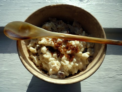 Kimi made me a rice pudding last weekend, which disappeared, like, dude, absurdly fast. I wanted more. My exhausted brain has just been stuck on it. Rice pudding? Rice pudding, gelfling, please?
