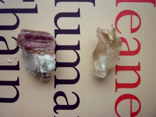 I can’t remember what the other is, but the one on the right is rose quartz crystal… which, the lady assured me, is different from normal rose quartz. I guess because it formed the way crystals form?