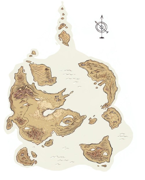 So to start with, I’ll briefly introduce the world that I’m working with. The group of islands and small continents you see on the map up there is called The Crossing, and I’m titling my imaginary game after it. The Crossing is an interim world, where the great heroes of earth arrive when they die, and through which they may pass in order to attempt to reach the land of the Gods. This will make more sense at length, and in a later post I’ll scribble the map over with more detailed locations, but for now I’ll keep it simple.