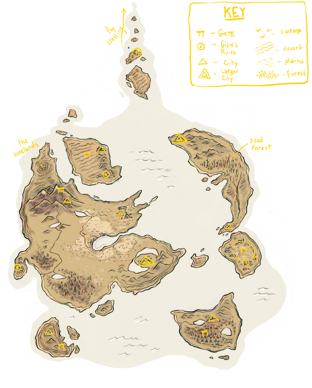 Travelling North, most of the land is desert, and once you pass the northernmost city in The Crossing, the climate becomes increasingly unforgiving – it’s like trying to survive in high altitudes, and if you aren’t fit for it, then even standing still and breathing can be mortally difficult. At the point of crossing – up in the farthest islands – the climate is completely inhospitable to life, and the land is littered with the dust-preserved corpses of heroes who have attempted to become gods, and died at the threshold.