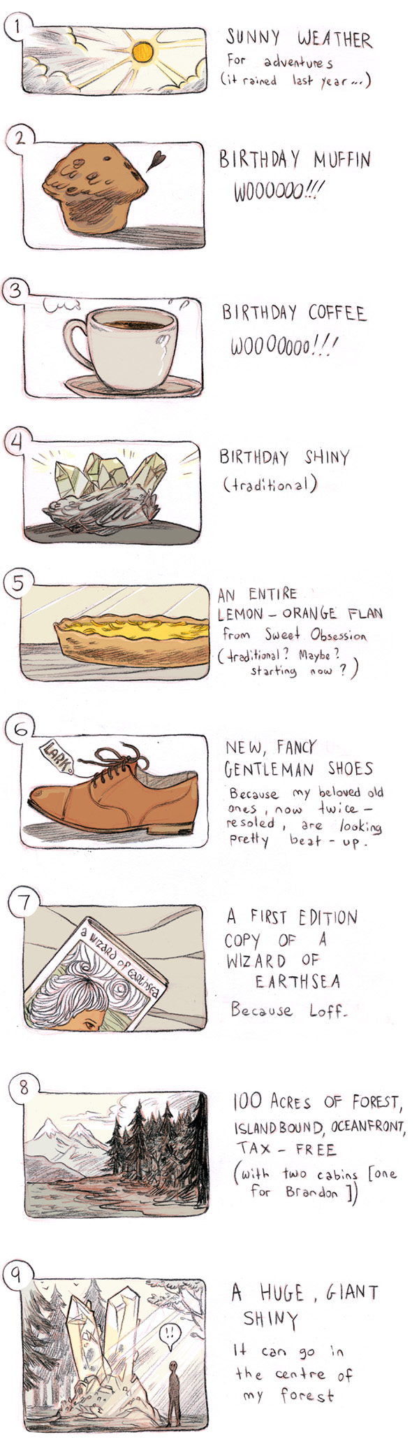 19. I love the shiny!! Both of them haha. Today is my bff’s bday too. She doesn’t like coffee but she’s getting cupcakes, and she doesn’t know it yet. :) love your list. I may make one come July but without the cool drawings. *sigh*