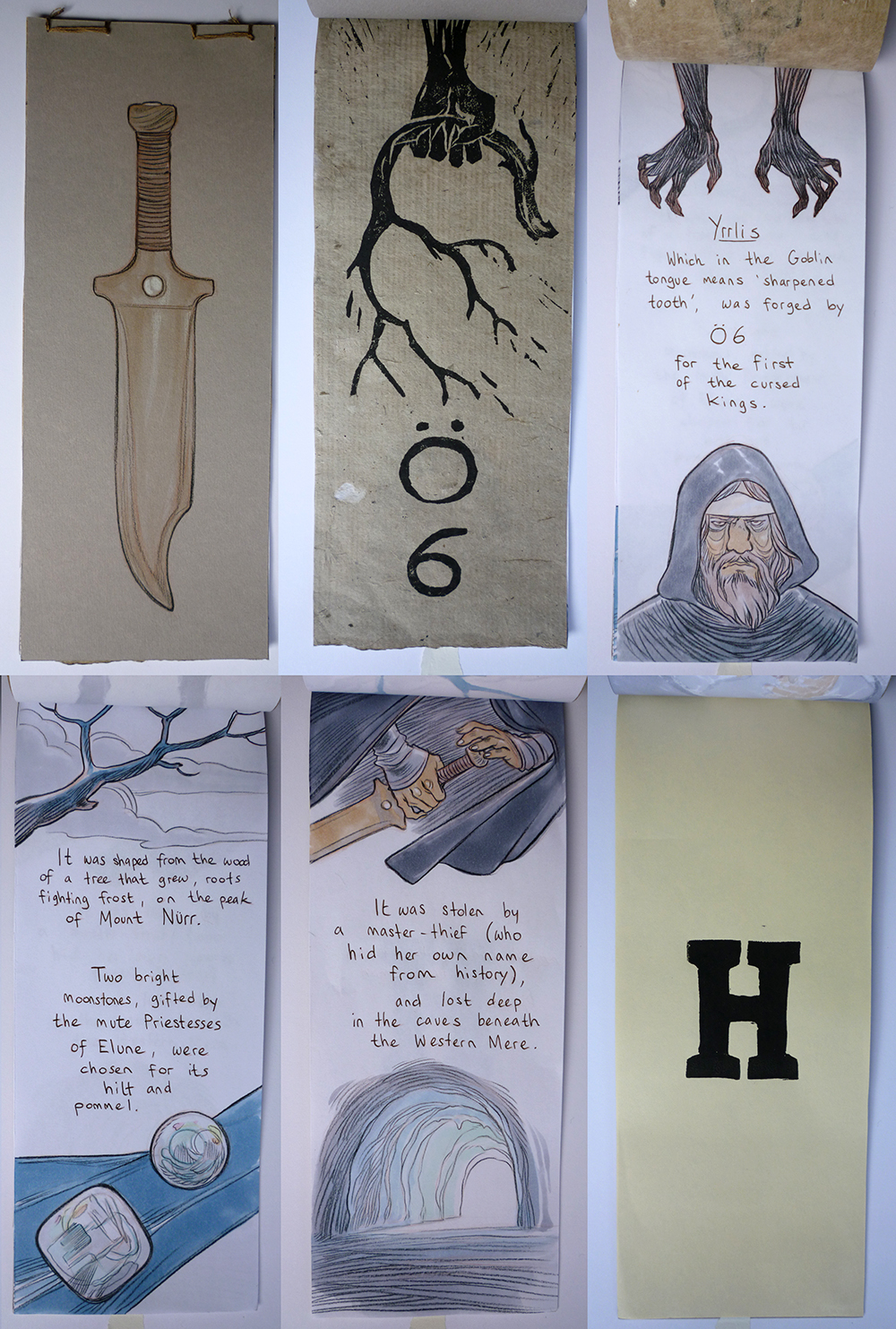 As well as the big dagger packs, I’ve put together some illustration packs in the $50-70 range. Since I was already making block prints to include in the dagger booklets, I re-printed a couple copies of an old sleeping mouse linoblock, and you can find those in the options as well. As always, everyone gets a sketch with their package – just let me know what you’d like to see. Email me (marianchurchland@gmail.com) to purchase packs, or ask questions.