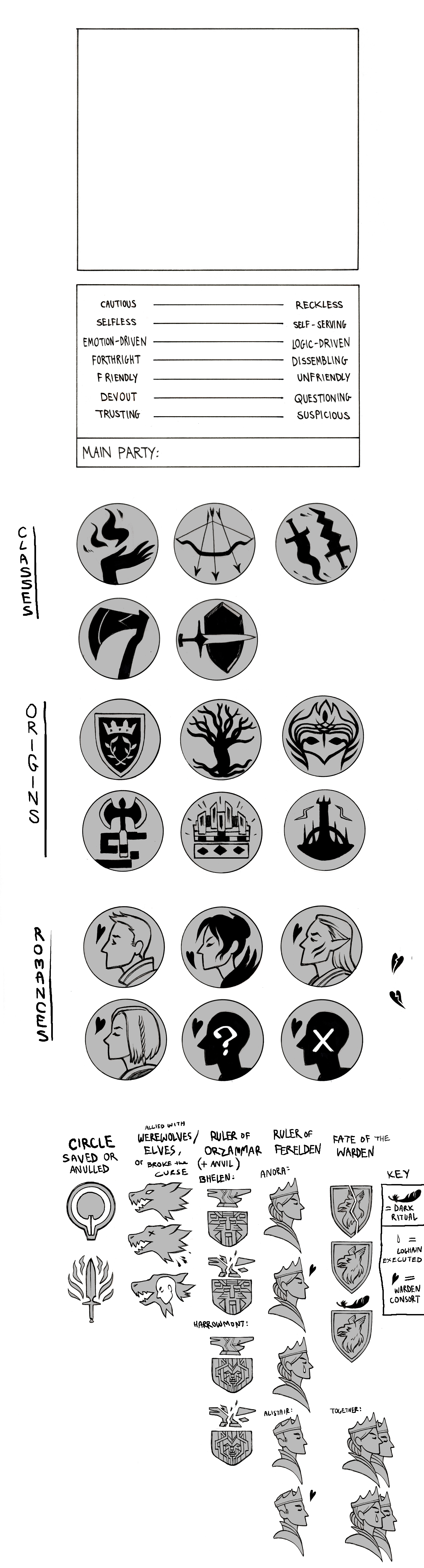These Dragon Age character templates are old news, but I was really thrilled to see a bunch of people using them. And since the original source is gone, I wanted to re-link them for those arriving late to the DA world – or for anyone who may feel an overpowering need to rate their character’s personality according to my wondrous When Dealing With Stuff ™ System.